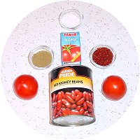 - 1 kutu kırmızı fasulye konservesi - 2-3 çorba kaşığı domates salçası - 2 adet domates - Kimyon, tuz ve kırmızı pul biber