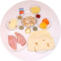 - 2-3 parça tavuk göğsü (1/2 kg kadar) - 10-15 adet mantar - 2 adet (mümkünse kırmızı ya da turuncu) dolmalık biber - 1 baş kuru soğan - 1 çorba kasesi mısır - 200 gr. kaşar peyniri - 3 adet lavaş - Fesleğen, kekik, kimyon, tuz ve kırmızı pul biber