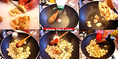 Öldürdüğümüz soğanları bir tabağa alırız ve bu sefer de yine az bir yağ ekleyerek ince ince dilimlediğimiz mantarları ekleriz ve içerisine biraz kimyon, biraz da pul biber ekleyerek suyunu salana ve sonra da tekrar çekene kadar orta ateşte çeviririz. İçerisine tuz koymuyoruz çünkü bir iki tatlı kaşığı kadar eklediğimiz soya sosu zaten gereken tuzu yemeğimize veriyor.
