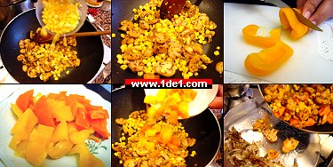Ardından yıkanmış mısırlarımızı da ekleriz ve yüksek ateşte 5 dakika kadar pişiririz. Sonra içerisine kalın dilimlenmiş dolmalık biberlerimizi de ekleriz ve 2 dakika daha pişirdikten sonra bunları da bir kaba alırız.