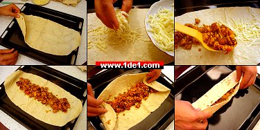 Bir lavaşı düz bir zemine serdikten sonra orta kısmına bir miktar rendelenmiş kaşar ekledikten sonra hazırladığımız malzemeden koyarız ve lavaşın önce uçlarını sonra da uzun kenarlarını kıvırarak dürüm haline getiririz. Ardından da ters çevirerek fırın tepsisine dizeriz.