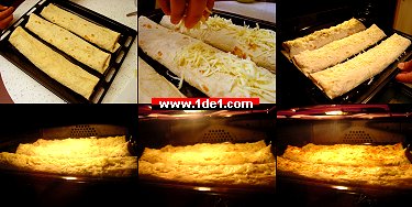 Daha sonra dürümlerin üzerine, kalan kaşar peynirini dökerek ısıtılmış fırına veririz ve üzeri kızarana kadar pişiririz.
