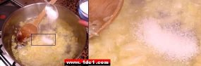 Yağ yanmaya yakınken içine soğanlar atılır ve bir süre böğürtülür ( öldürmek gibi bir şey galiba, yanlış ta olabilir, çok küçükken babaannemden duymuştum ). Bu işlem yaklaşık 1-1.5 dakika kadar sürer ve sonra soğanlara 1 tatlı kaşığı kadar toz şeker konularak karamelize edilir, bu hem soğanlara hoş bir görüntü verir hem de lezzet katar.