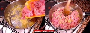 Artık soğanlar pembeleşmiştir, hindimiz bu karışıma eklenir ve karıştırılır.