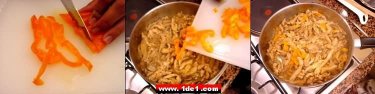 Biz de bu arada yarım ve hatta bir tam kırmızı ya da turuncu büyük dolmalık biberi ince şeritler halinde doğrarız, bunun yanı sıra etin içine tamamen isteğe göre 2 diş kadar sarımsak ta dövülüp konulabilir. Dilimlediğimiz dolmalık biberi de bu karışımın içerisine ekledikten sonra bir kaç dakika kadar daha karıştırılır ve artık hindi yemeğimiz hazırdır.