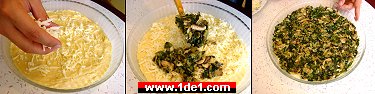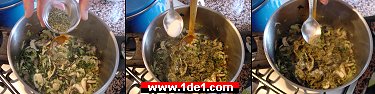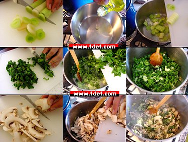 Hamur dolapta beklerken biz iç malzemelerini hazırlayalım. Bir tencereye çok az miktarda sıvı yağ koyun, yağ kızdıktan sonra önceden ince dilimlere böldüğünüz pırasaları bu yağda öldürün. İçine yıkanmış, ayıklanmış ve kalanı doğranmış (bizimkilerin yarısı çürük çıktı da... :) ıspanakları da ekleyin ve kavurmaya devam edin. Kavurduktan sonra içine ince ince dilimlediğiniz mantarları ekleyin ve 5 dakika kadar daha kavurun. Mantarları başta ıspanaklarla beraber koyarsanız suyunu verebilir dolayısıyla sonradan eklemek daha mantıklı.