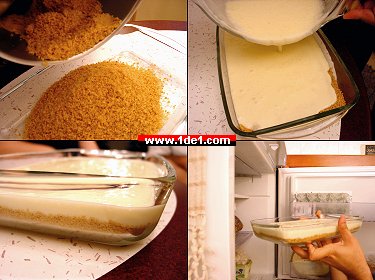 Sonra bunu bir cam (dipfrize dayanıklı olmalı) kaba yayıp üzerine hazırladığınız karışımı dökün. Dolabın derin dondurucu kısmında en az 2-3 saat bekletin.