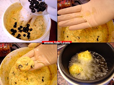 Çaresiz olarak normalde topların içine elimizle yerleştirmemiz gereken zeytin dilimlerini tüm hamurun içerisine karıştırdık ve sanki olması gereken de buymuş gibi davranarak, yağladığımız eldivenimizle ceviz büyüklüğünde hamur topları yapıp kızgın yağa attık ve 2-3 dakika kadar kızarttık. Güzel oldu, yani kötü olmadı... Ama bence çok daha güzel olabilirdi... Mesela eğer hamuru evde yapsaydık, içerisine sulu sulu havuçları koymasaydık ve zeytini dilimlenmiş almak yerine kendimiz çekirdeklerini çıkartarak koysaydık daha güzel olurdu. Görüntü olarak güzel gözükse de hazır dilimlenmiş zeytinler kesinlikle bizim sofra zeytinlerimizin yerini tutamaz ama onun da çekirdeğini çıkartmak çok zor, ne yapacaktık yani kameranın karşısında zeytini dişleyip çekirdeğini çıkartamazdık ki... Ama siz evde öyle yapın, ama dikkat edin de yiyenler de bu yazıyı okumuş olmasın... :)
