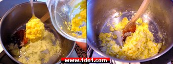 Diğer tarafta mısırların yarısı ya da biraz daha fazlası rondoda parçalanır (katil rondo ne olacak, işi gücü paralamak) ve soğanlara eklenerek kısa bir süre beraberce kavrulur.