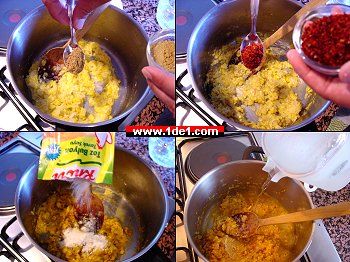 Sonra içine tavuk bulyon, ve tamamen isteğe bağlı kırmızı pul biber ve kimyon konur, bunlardan hemen sonra da 1 litre kadar su