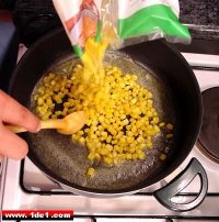 Yağ kızdıktan ve hatta çok hafifi yandıktan sonra SuperFresh ’in dondurulmuş mısırından konur. Konulacak mısır miktarı tamamen isteğe bağlıdır, pilavın ne kadar mısırlı olmasını istiyorsanız o kadar koyarsınız. Biz mısırı çok sevdiğimizden yaklaşık 1 kase kadar koyduk.