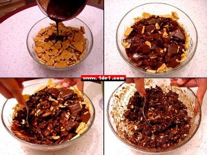 Artık pastamızın sosu hazırdır, bu karışım kırık bisküvilerin üzerine yavaş yavaş dökülür ve karıştırılır. Tüm bisküviler bu sosla kaplandığında işlem tamam demektir.