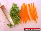 Öncelikle yanımızda hazır olsun diye sebzelerimizi doğrayalım, burada sebzeler büyük ölçüde göze hitap ettiğinden biz havuç ve taze fasulyeyi tercih ettik. Siz bunlara ek olarak kırmızı dolmalık biber ya da soya filizi gibi sebzeler de ekleyebilirsiniz. Tamamen zevk meselesi... Biz sebzeleri keserken havuçları ince şeritler halinde, fasulyeleri ise baklava şeklinde kesmeye dikkat ettik.