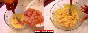 içine kuşbaşı şeklinde doğradığımız tavuklar atılır ve tavukların üstü tamamen mısır unuyla kapanana kadar karıştırılır.