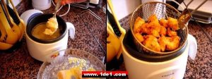 Beri yanda tavuklar, şiddetle kızdırılmış yağın içine birbirine yapışmayacak şekilde atılır ve pembeleşene kadar (bizce pembeyi biraz geçsin) 3-5 dakika kadar kızartılır. Biz mini fritöz kullandık siz daha büyük bir fritöz ya da kızartma tenceresi kullanabilirsiniz.