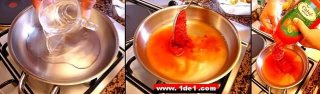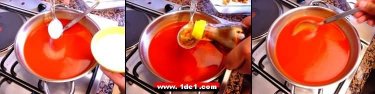 kızarırken artık biz de sosumuzu hazırlamaya başlayabiliriz; Önce büyükçe bir sahanın içine 1 bardak su konulur (uygun boyda bir tencere de kullanabilirsiniz), salça ve ketçap eklenerek karıştırılır.