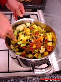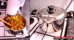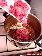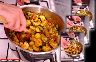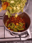 Hindinin rengi artık salçanın da yardımıyla iyice koyulaştığında, ki bu yaklaşık 10 dakika kadar sürüyor (orta ateşte), içine sebzeler eklenebilir.