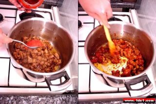 Hindilerin de rengi değişince bu sefer bir, bir buçuk çorba kaşığı salça eklenir ve karıştırılır.