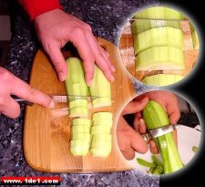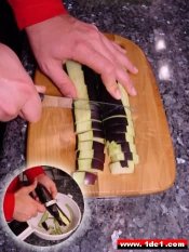 Daha sonra kabağın kabuğu soyulur ve o da patlıcanla aynı büyüklükte dilimlenir.