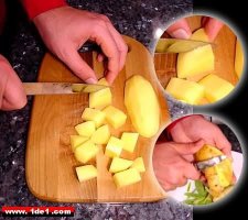 Patatesler de kabukları soyulduktan sonra küp şeklinde dilimlenir.