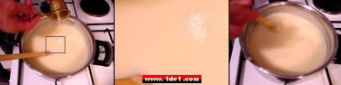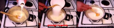 Bu güzel renkli karışıma bütün sütümüzü ve ardından da şekerimizi ekleriz ve yine karıştırmaya devam ederiz. "Karıştırma" sizin de anladığınız gibi bu ve bunun gibi bütün tatlılar için çok önemli bir kavramdır. Çünkü tatlı içerisinde homojen bir karışım sağlanmasını ancak düzenli karıştırmayla sağlayabiliriz ve böylece en uygun kıvamı tuttururuz. Yoksa tencerenin çok daha sıcak olan dibinde sert parçacıklar meydana gelir ve bunlar tüm tatlı içerisine dağılarak ağız tadınızı mahvederler.